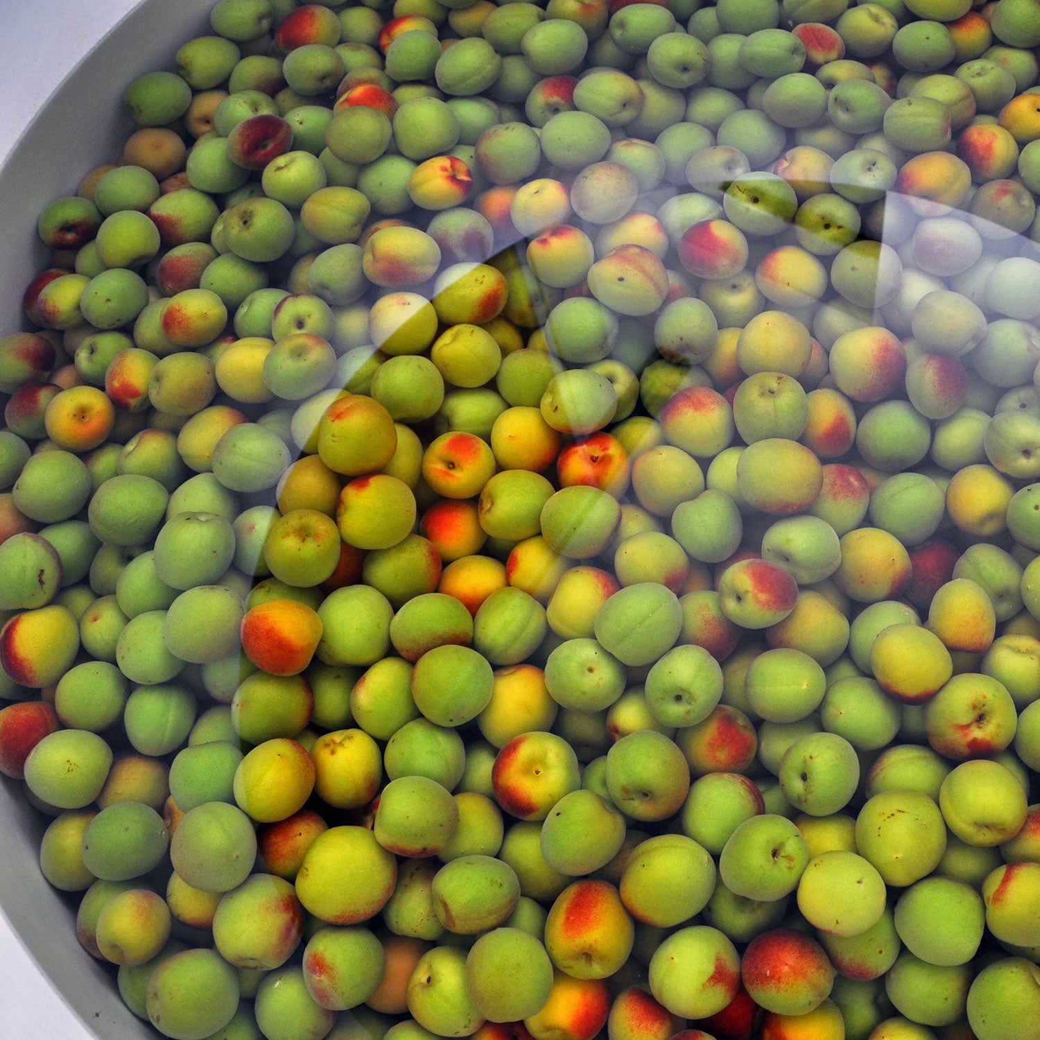 【酒造用タンク】容器内の温度を均一にでき、梅の品質ごとに細かいケアが可能な、小型タンクによる仕込みと熟成。下の画像は「仕込んだ直後」の様子。黄緑と紅が映えて美しい。